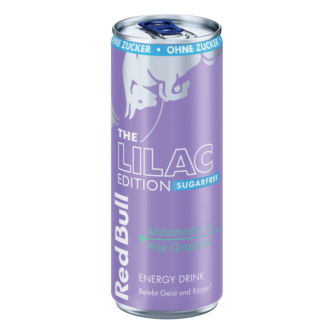 Die Red Bull Lilac Edition Sugarfree mit dem Geschmack von Pink Grapefruit, Waldmeister und floralen Noten.